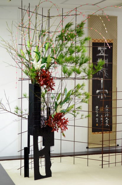 ご自身が制作された鉄の花器に松・南天などを生け込み
