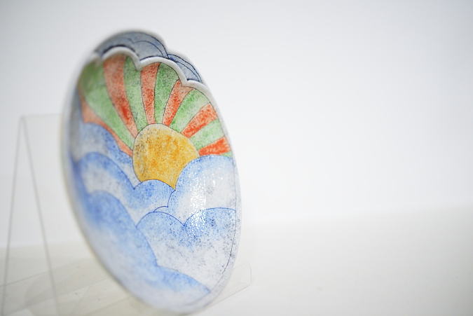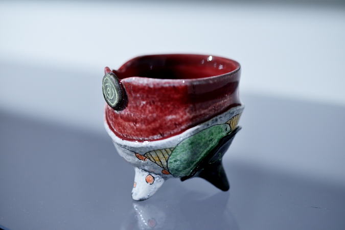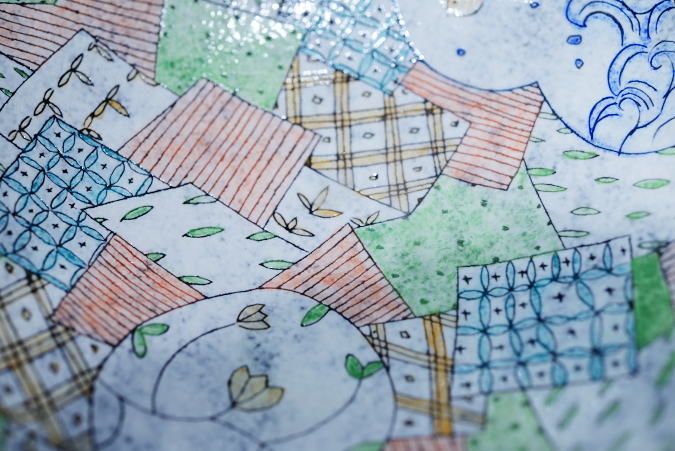 細かく彫り込まれた軽やかな柄が作品の上で踊ります。明るい色使いと動きのある形は