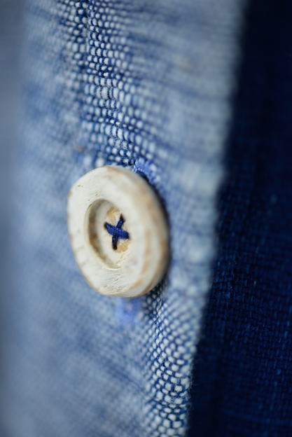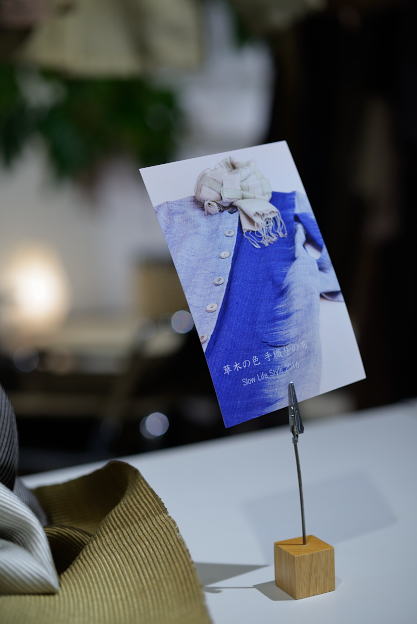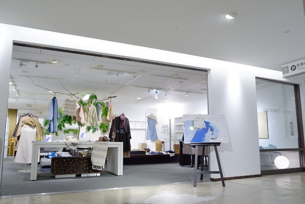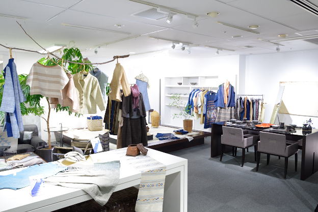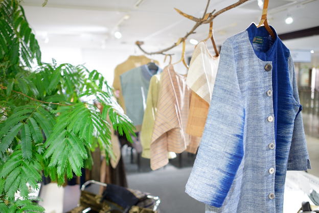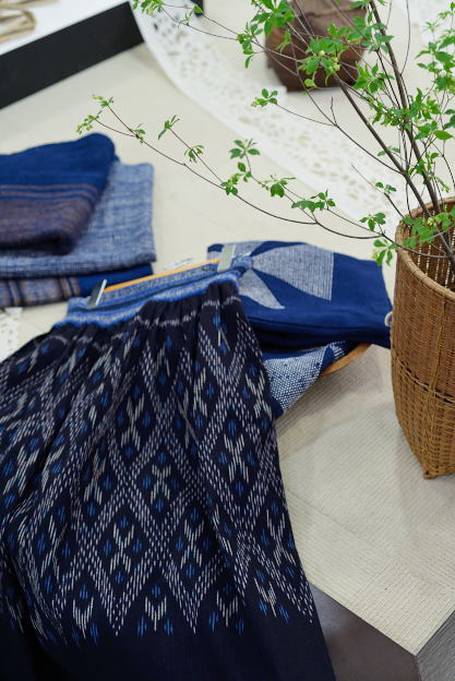 発酵建による藍染のかすり織りからできた布を使った衣服の数々。