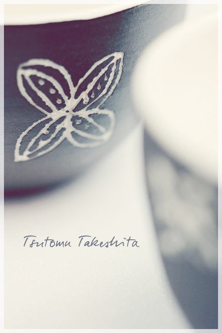 白い磁器土に黒い粘土を塗り、針のような先の尖ったモノで文様を描く、
