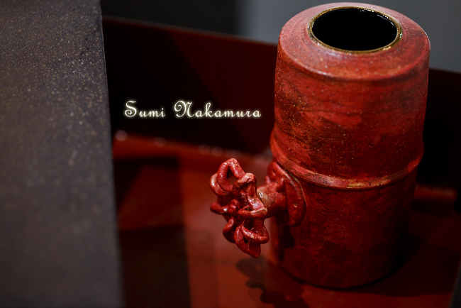 赤茶色のマットな釉薬で皮の表情を表現しています。陶器なのに、布や皮、金属などの
