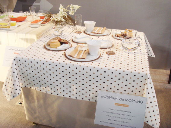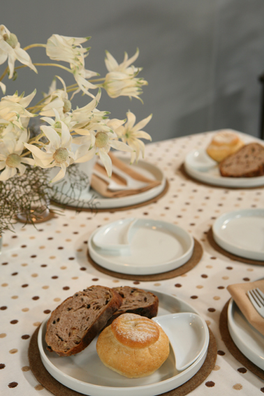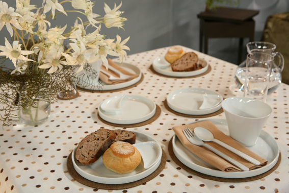 小さなドッド模様のクロスと優しげなフランネルフラワー。